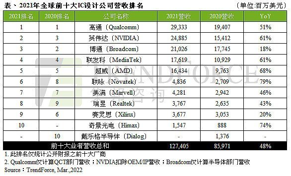 據(jù)TrendForce集邦咨詢(xún)研究顯示,2021年由于各類(lèi)終端應(yīng)用需求強(qiáng)勁,導(dǎo)致晶圓缺貨,全球IC產(chǎn)業(yè)嚴(yán)重供不應(yīng)求,連帶使芯片價(jià)格上漲,拉抬2021年全球前十大IC設(shè)計(jì)業(yè)者營(yíng)收至1,274億美元,年增48%。